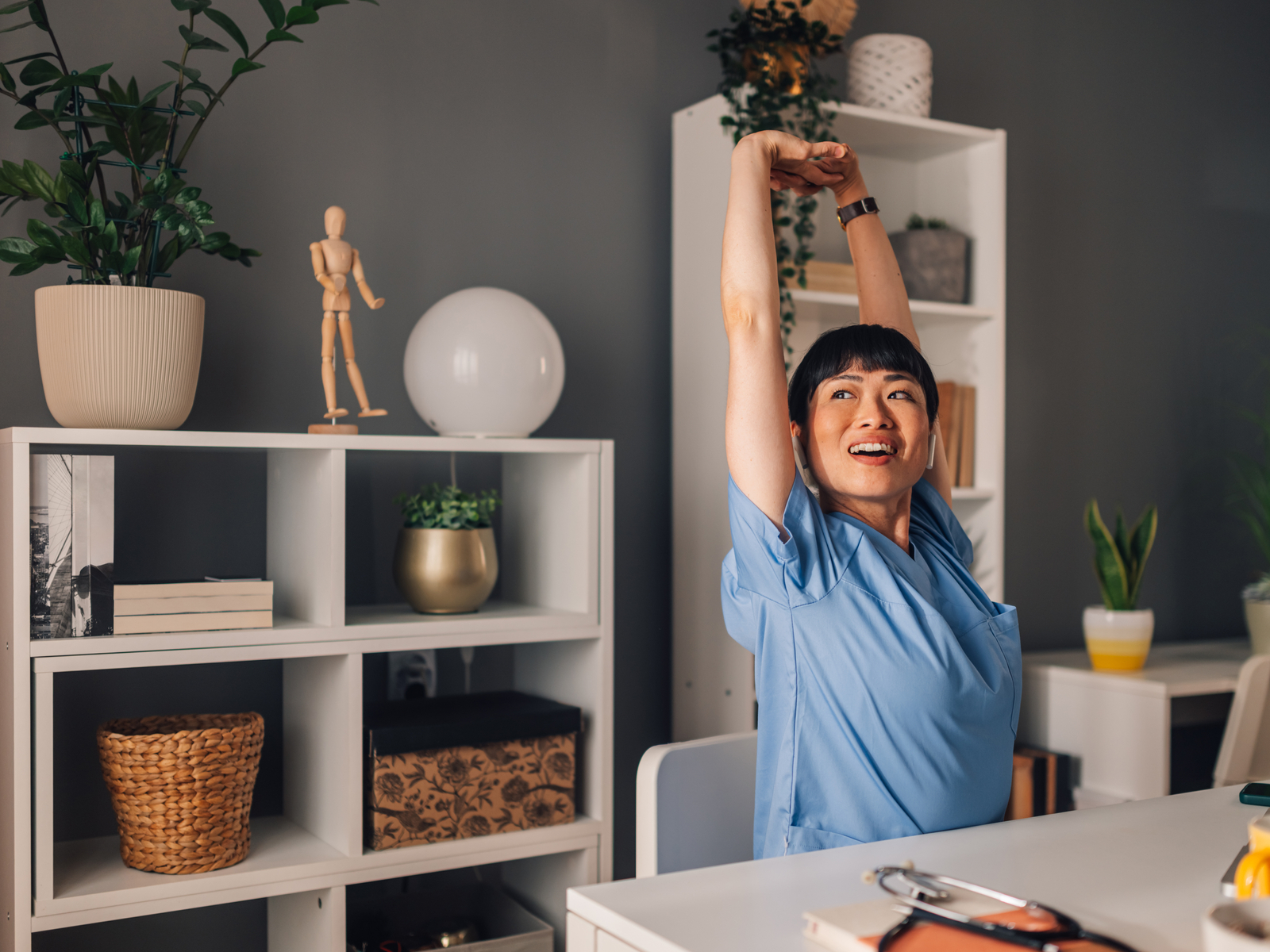 When you change positions, take a break to stretch or do the Brugger exercise. For this exercise, sit up straight at the edge of a chair with your feet flat on the ground and arms to your side. Stretch your arms out and then backward while pinching your shoulder blades together. This can help relax tight neck and back muscles.